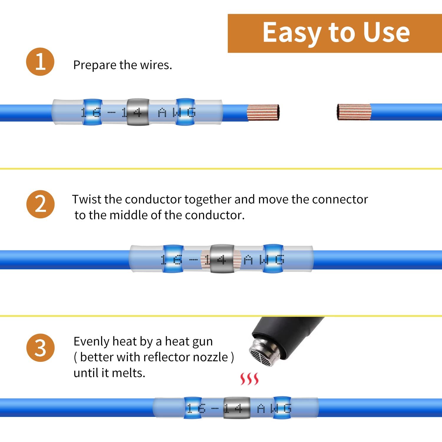Easy to Use: Heat shrink wire connectors can be connected with just a heat gun, no crimping tool or soldering machine is needed