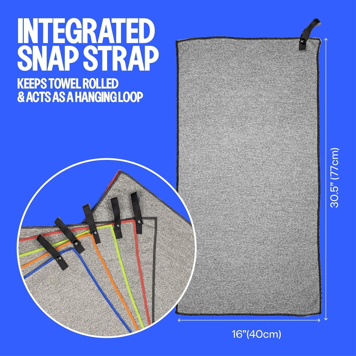 ULTRA COMPACT, LIGHTWEIGHT, STAY CLEAN WITH HANGING LOOP: With an integrated snap strap closure that doubles as a hanging loop over the door, your backpack, or bottle. the large thin towel rolls up into a packable travel-friendly size. Perfect for anyone who travels light.