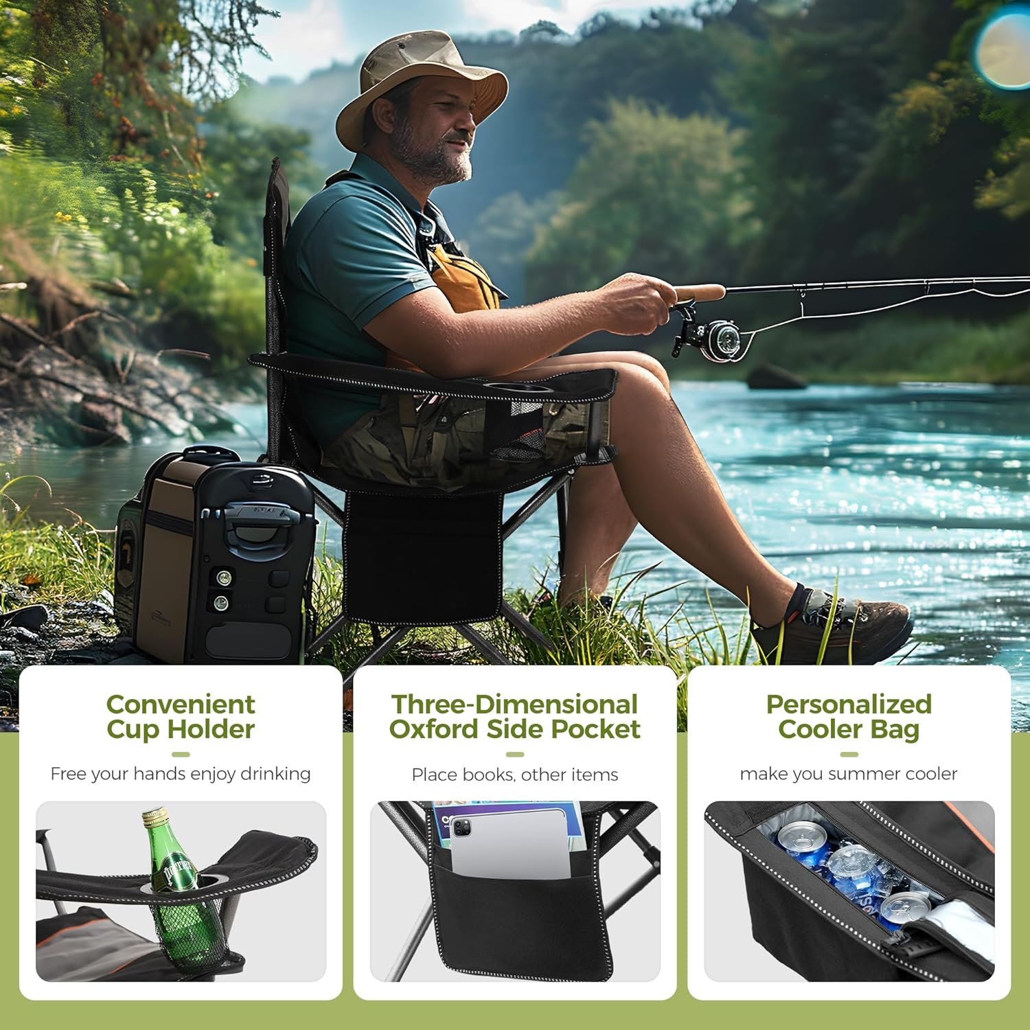 ❤【Extra Storage Spaces】 Durable mesh cup holder and armrest at the perfect height allows you to relax in comfort.side storage pocket holds cell phone, notebook and maps,side cooler bag will keep you cool on a hot summer day!