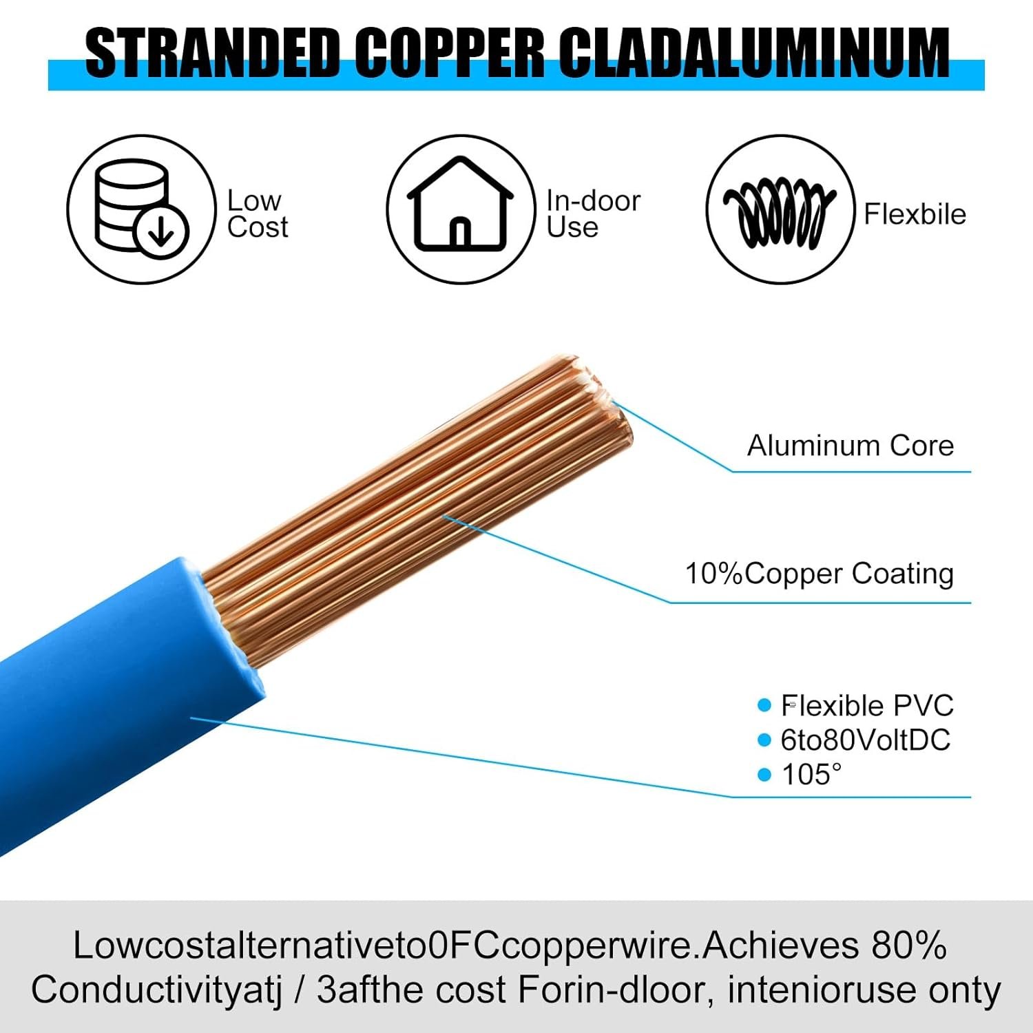 Reliable Copper Clad Aluminum: our 16 gauge automotive wire designed for automotive applications and audio speaker wiring, 12V auto wire is made of top quality Copper Clad Aluminum, which brings reliable and efficient power delivery for your 12 volt power requirements; Our cables provide nice power transmission performance while remaining cost effective, giving you a good balance between quality and economy