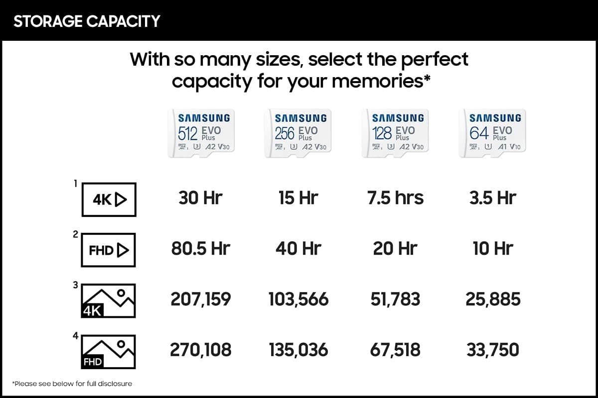 *Stated performance is achieved by using EVO Plus microSD cards with Samsung adapters. Compared to 2020 EVO Plus micro SD models when used with a Samsung adapter. **Speed and rating apply to 128GB, 256GB and 512GB cards. 64GB card is U1 rated, with transfer speeds of up to 130MB/s. Stated performance is achieved by using EVO Plus microSD cards with Samsung adapters. Ratings apply to 128GB and 256GB cards. 32GB and 64GB card is A1, V10, UHS-I rated. The foregoing read & write speed performance is based on testing of 512GB capacity under standard conditions. Actual speeds may vary depending upon card capacity. ***Test Device: Samsung Note Ultra. 4K Video (3840*2160) 30fps (Video size 30Min 7.93 GB). FHD Video (1920*1080) 30fps (Video size 30Min 2.95 GB). Image 4000*3000 (Avg Pic size 2.36 MB). Image 4000*1868 (Avg Pic size 1.81 MB). ****Samsung is not liable for any damages and/or loss of data or expenses incurred from memory card data recovery. Waterproof: withstand up to 72 hours in seawater. Temperature proof: operating temperatures of -25 C to 85 C; non-operating temperatures of -40 C to 85 C. X-Ray Proof: up to 100mGy, equal to airport X-ray machines. Magnetic-Proof up to 15,000 gausses, or the magnetic field equivalent of a high-field MRI. Drop: withstand drops up to 5meters (16.4 feet). Wearout: up to 10,000 swipes. Proofs are for the microSD card and do not include the adapter. *****Source: 2003-Q3 2020 IHS Markit data: NAND suppliers’ revenue market share.