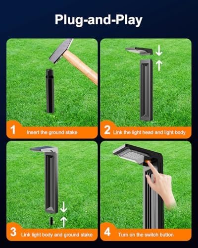 Easy Installation & No Wiring Needed: Our solar yard lights are plug-and-play and can be installed in three simple steps. First, insert the provided ground stake vertically into the ground. Second, snap the light head into the lamp post’s notch (ensure the light head faces the groove on the lamp post). Third, insert the assembled lamp body into the top of the ground stake. These quick installation steps eliminate complex wiring, offering you a more convenient outdoor lighting solution.